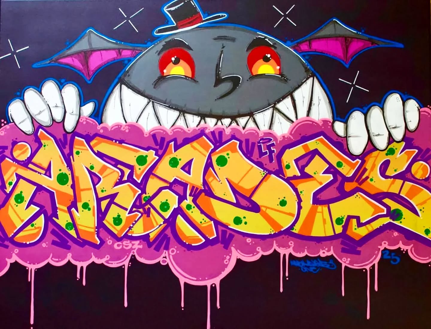 “Bat Country” (30″x24″) by Arkaydez — a bold homage to the gritty ‘90s black book era that defined his early style. Crafted with aerosol and acrylic on canvas, this striking piece captures the raw energy of his roots. Available now for collectors.